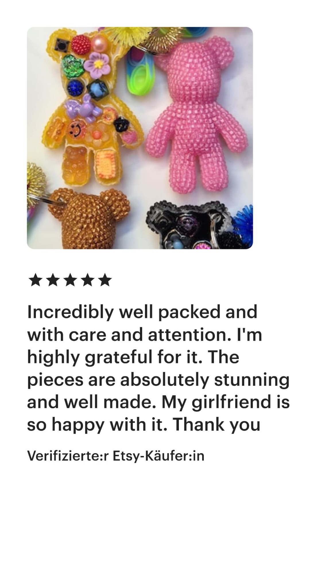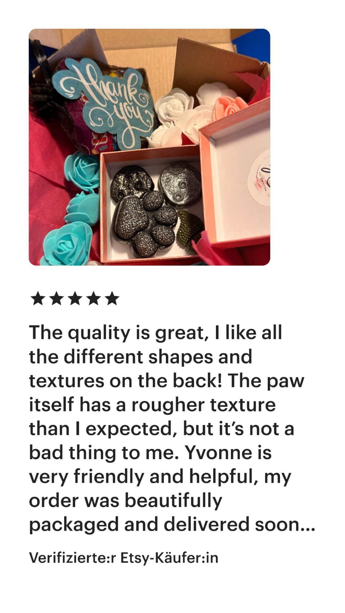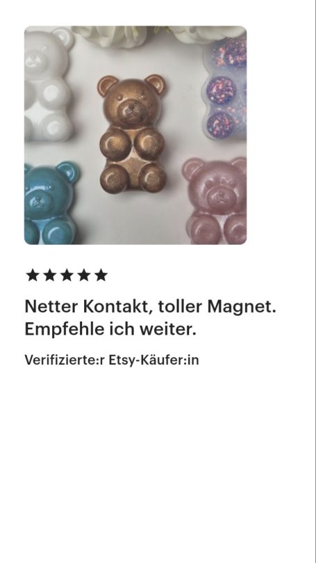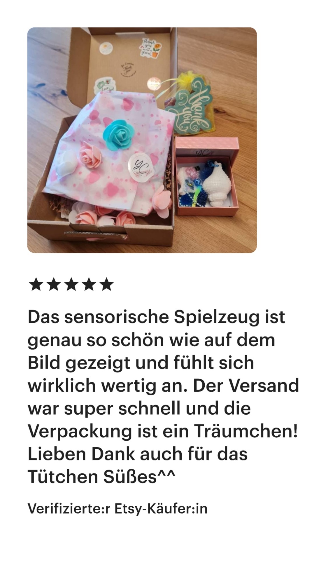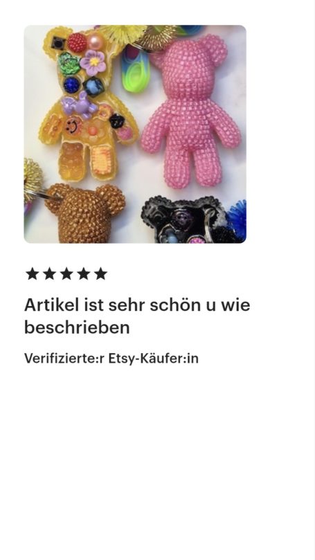 Dieser Shop ist neu, und ich kann nachvollziehen, wenn du dir unsicher bist, ob du mir vertrauen kannst. Ich lege großen Wert auf Vertrauen und Sicherheit. Aus diesem Grund habe ich einige meiner Bewertungen von Etsy für dich zusammengestellt, die du auch unter https://yvicreation.etsy.com findest. Ursprünglich habe ich auf Etsy gestartet, habe jedoch den Wunsch, für meine Fidget-Spielzeuge einen eigenen Shop aufzubauen.